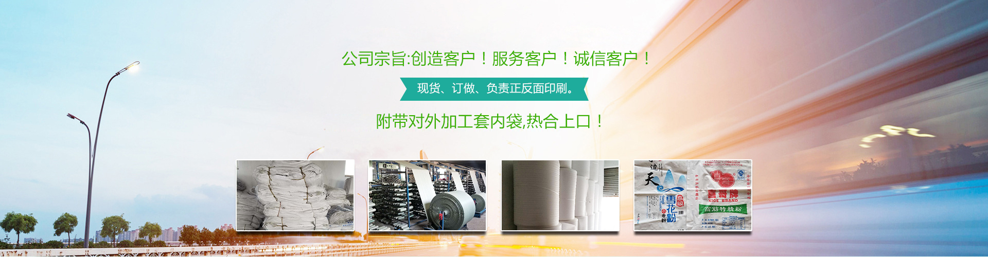 本公司常年生產(chǎn): 編織袋、彩膜、食品袋、集裝袋、飼料袋、化肥袋、水泥袋、化工袋、普危包裝袋、坯布專用內(nèi)袋、包皮、印染廠整裝專用包裝、有現(xiàn)貨、也訂做、負責正反面印刷。附帶對外加工套內(nèi)袋,熱合上口!聯(lián)系人:王經(jīng)理。 公司宗旨:創(chuàng)造客戶!服務(wù)客戶!誠信客戶! 13256289338.17686389888